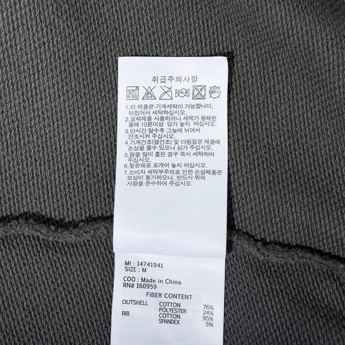 제품소재 겉감 : 76% 코튼, 24% 폴리에스터 / 립 : 95% 코튼, 5% 폴리우레탄