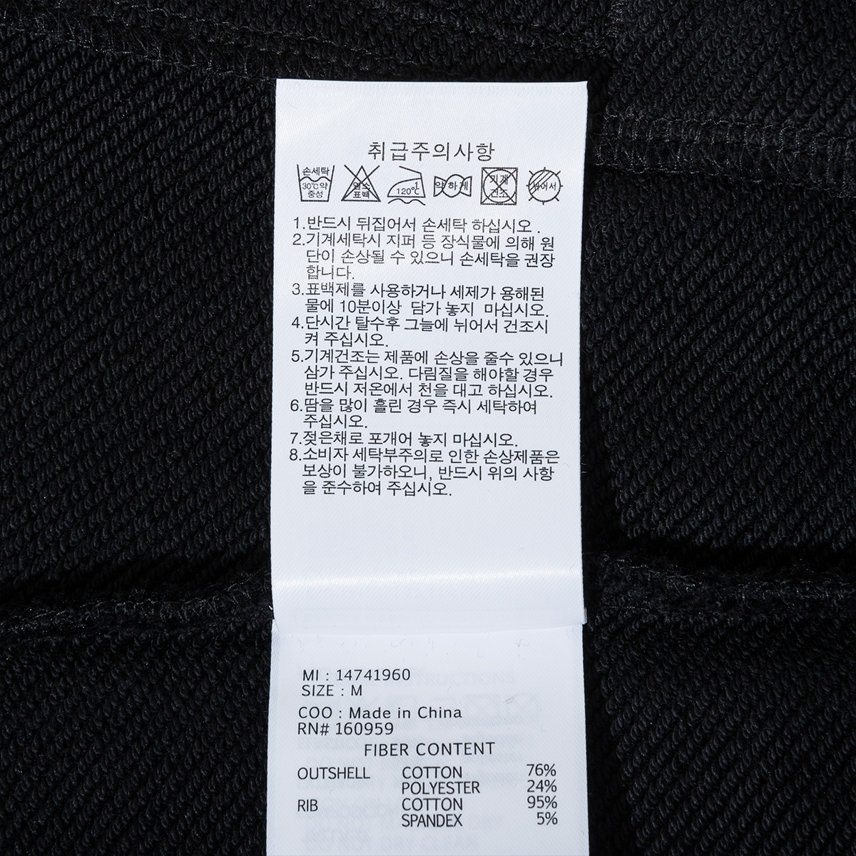 제품소재 겉감 : 76% 코튼, 24% 폴리에스터 / 립 : 95% 코튼, 5% 폴리우레탄