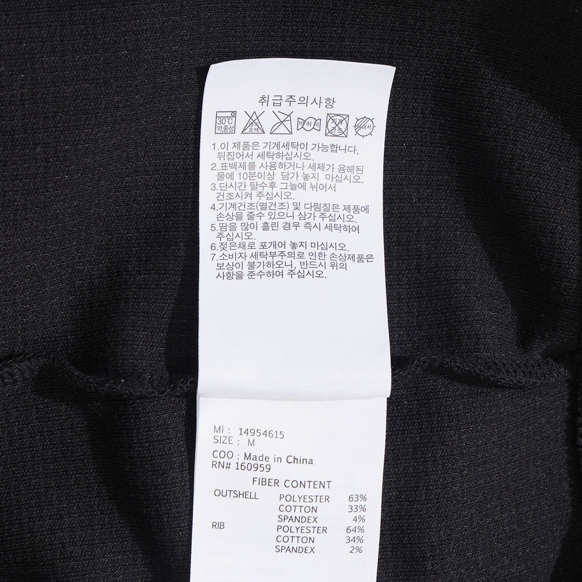 제품소재 겉감 : 63% 폴리에스터, 33% 코튼, 4% 폴리우레탄 / 립 : 64% 폴리에스터, 34% 코튼, 폴리우레탄 2%