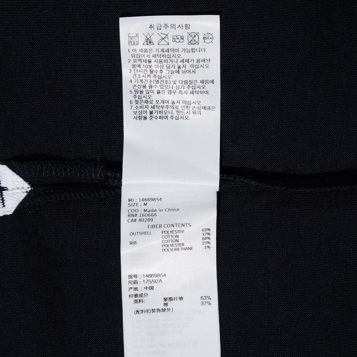 | 제품소재 | 겉감 : 폴리에스터 63%, 코튼 37% / 립 : 코튼 84%, 15% 폴리에스터, 1% 폴리우레탄 |