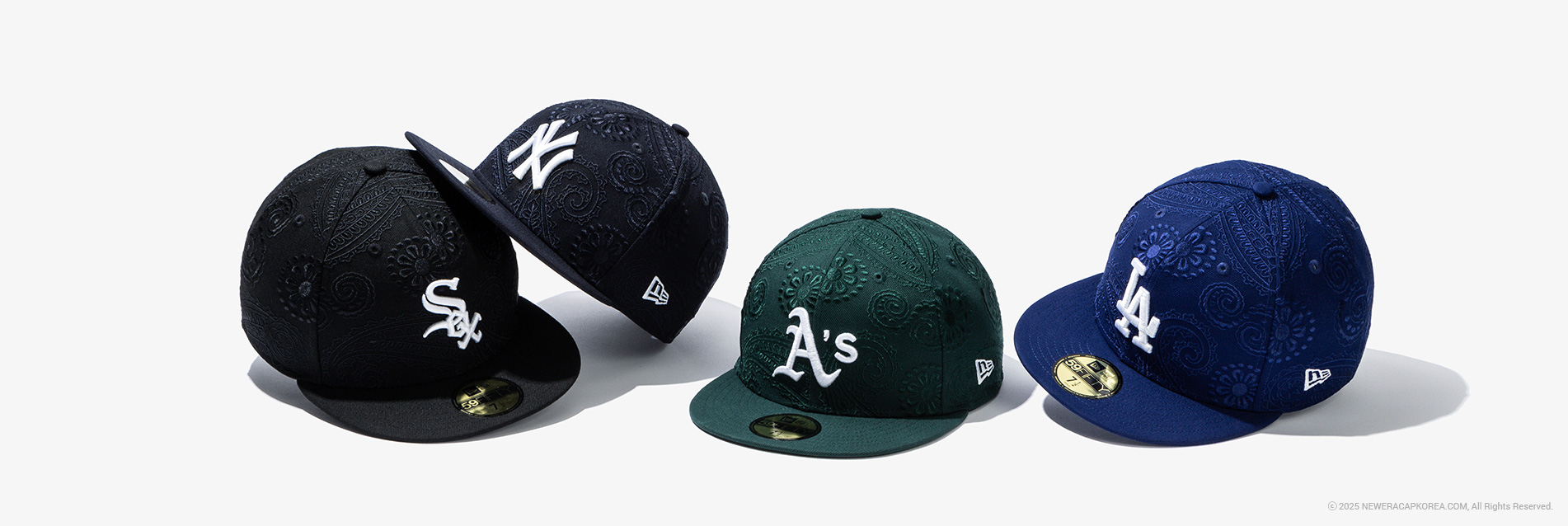 MLB 올오버 페이즐리 피티드캡 컬렉션을 소개합니다. 뉴에라의 아이코닉한 실루엣인 59FIFTY 피티드캡 실루엣으로 출시된 이번 컬렉션은 MLB의 인기 구단인 뉴욕 양키스, LA 다저스, 오클랜드 애슬레틱스, 시카고 화이트삭스의 4가지 스타일로 선보입니다. 모자 전면에 각 구단의 로고를 자수로 적용하여 포인트를 주었습니다. 구단의 시그니처 컬러를 활용하였으며, 각 패널에 올오버 형태의 페이즐리 패턴 자수를 패널 컬러와 동일하게 적용하여 은은하면서도 유니크한 존재감을 선사합니다. 아웃핏에 포인트 아이템으로 안성맞춤인 MLB 올오버 페이즐리 피티드캡 컬렉션을 지금 바로 만나보세요.